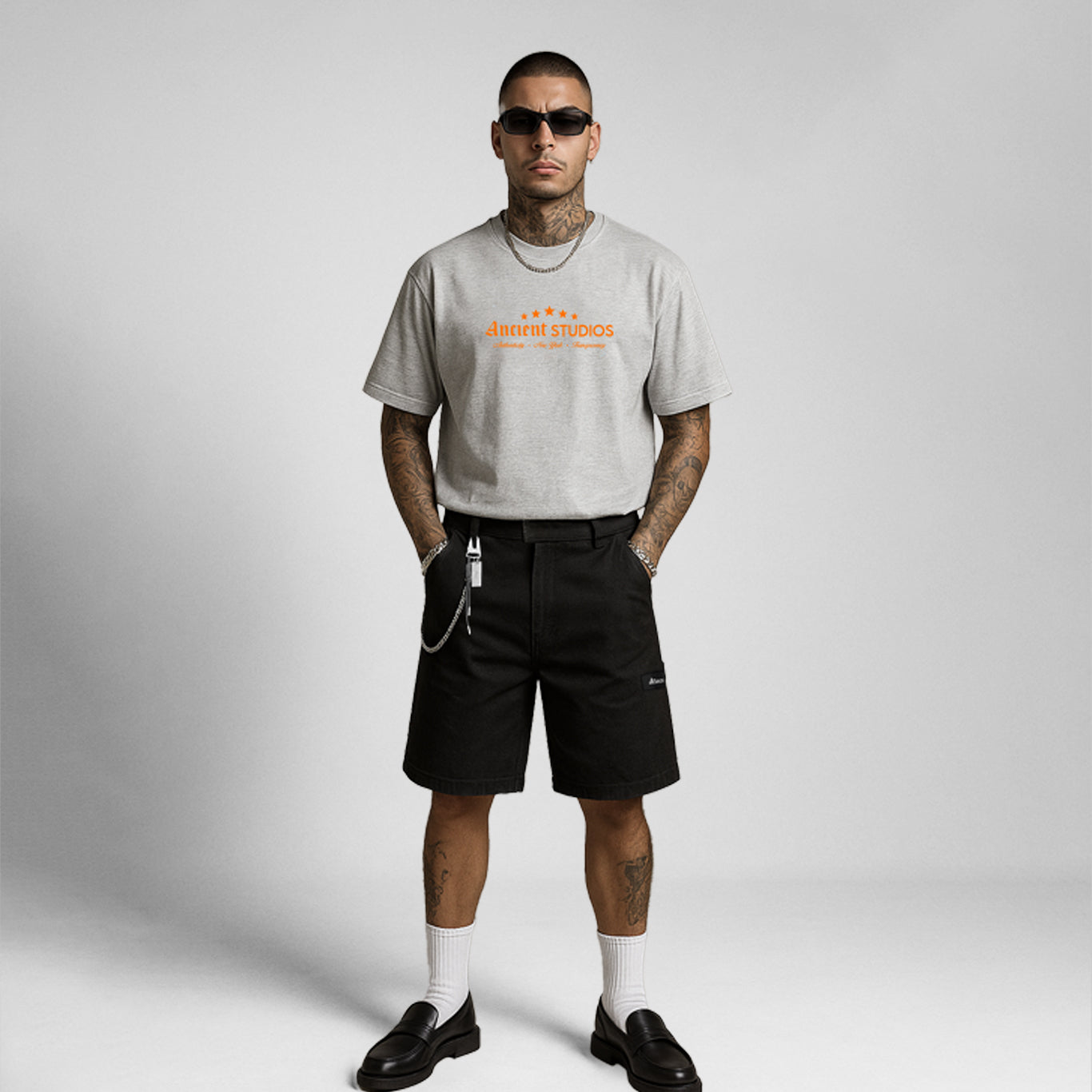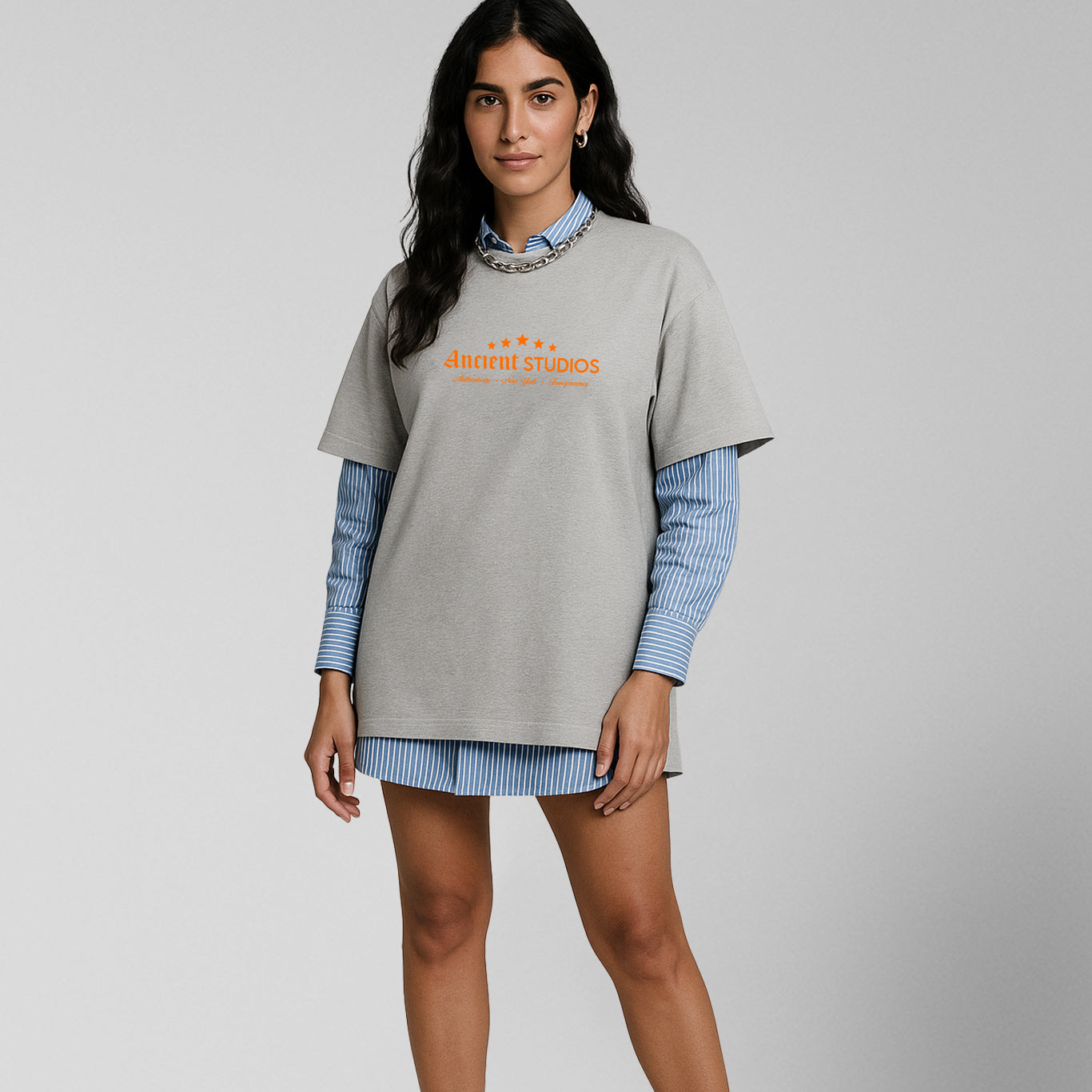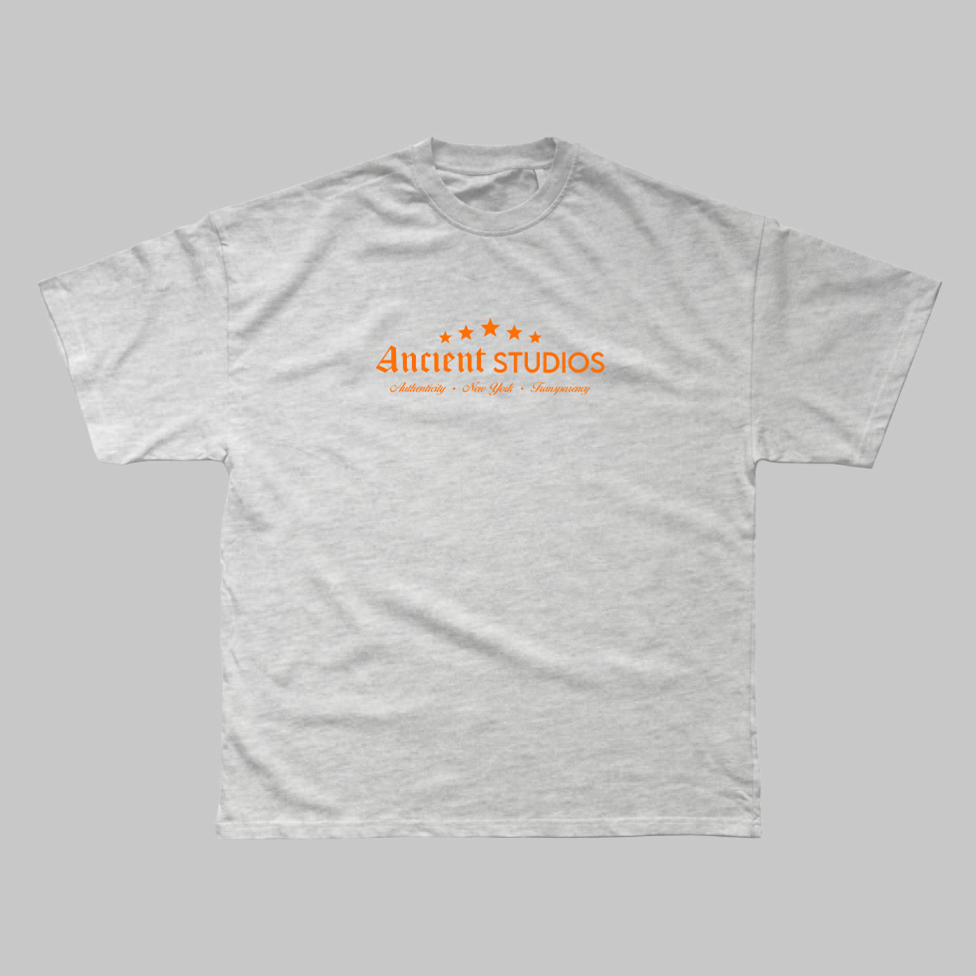 The Boxy Star T-Shirt in ash grey features an oversized fit with dropped shoulders and a ribbed collar for a relaxed, structured silhouette. Crafted with a soft handfeel and finished with a bold Ancient Studios® print, this unisex essential blends everyday comfort with signature style.