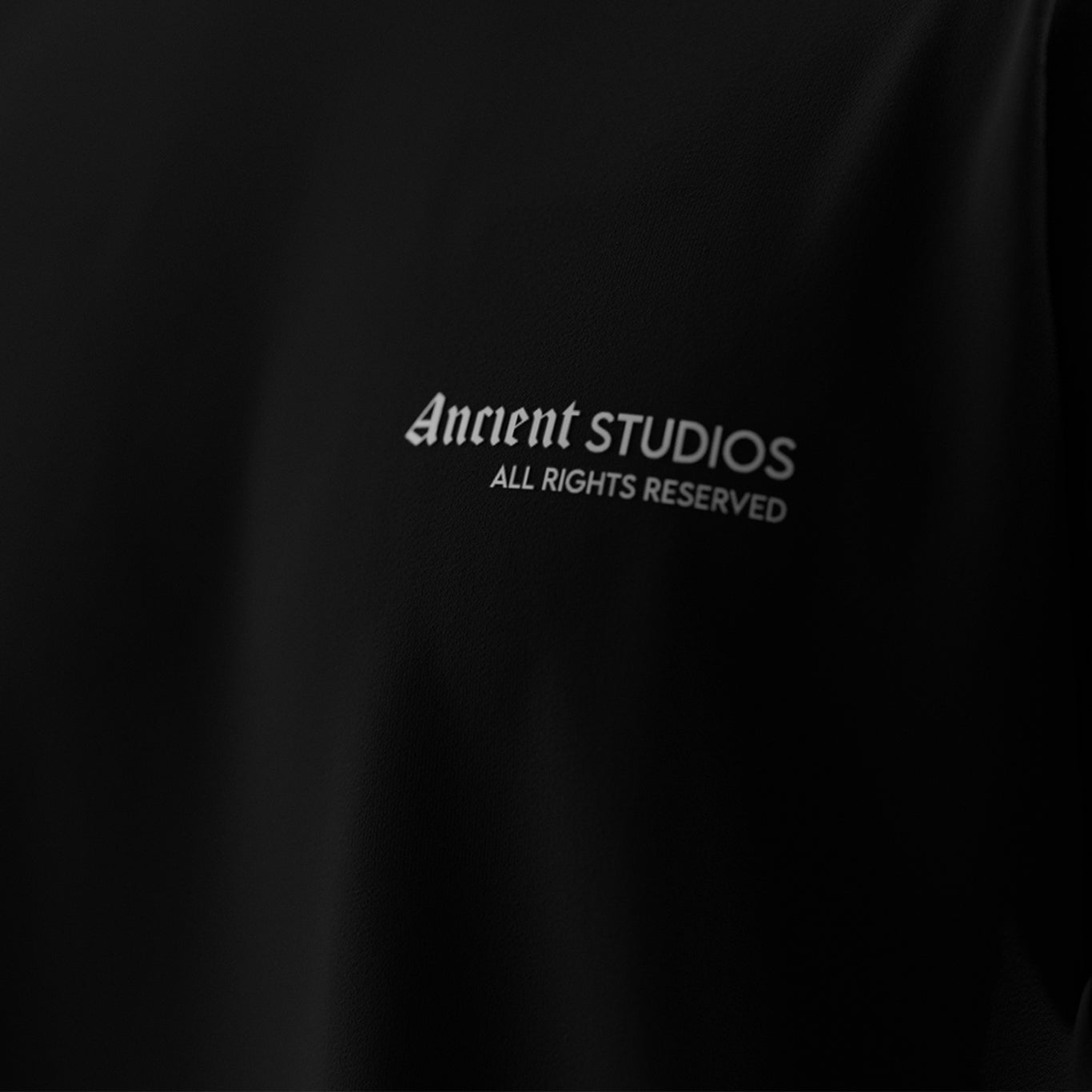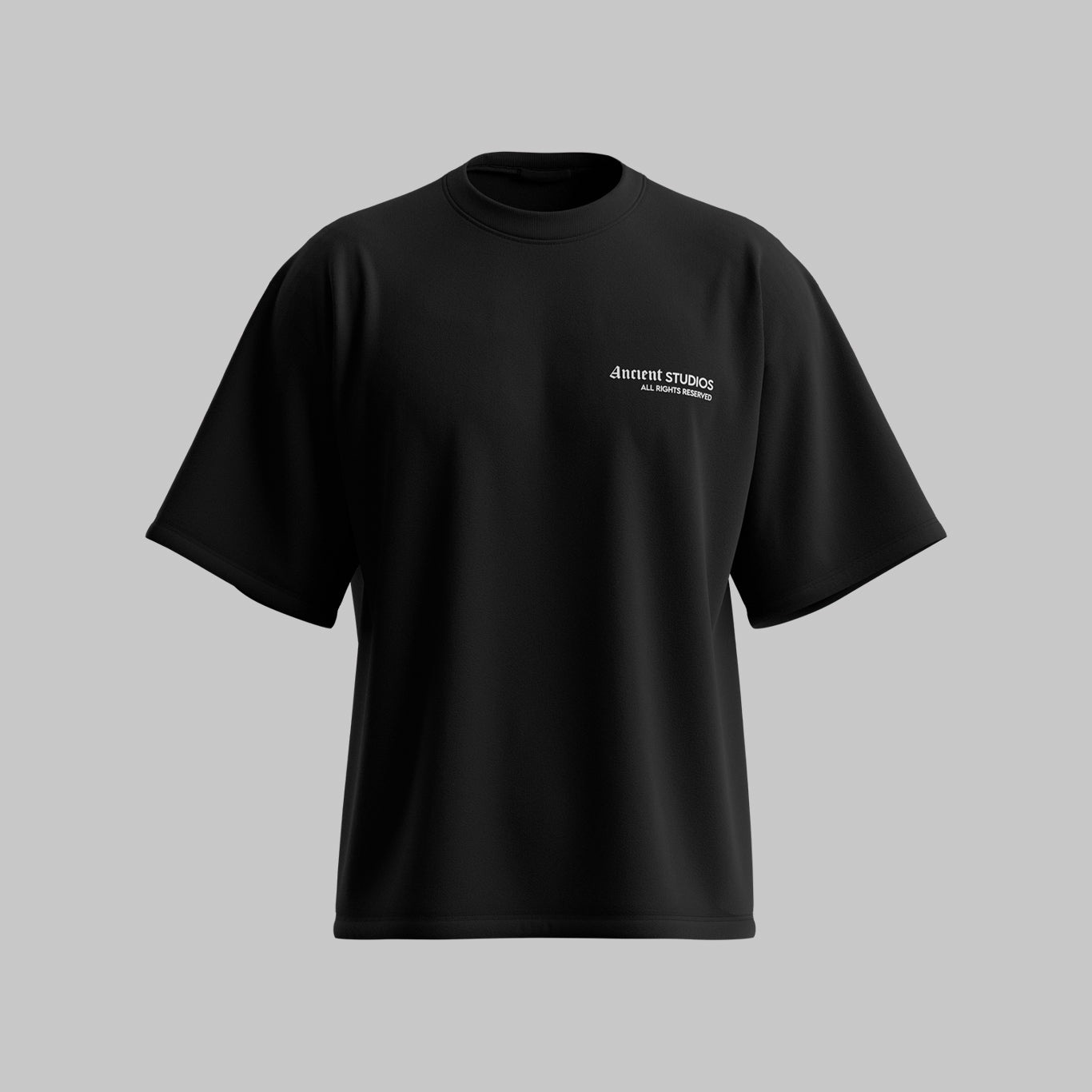 The Fundamental T-Shirt in black features an oversized fit with dropped shoulders, short sleeves, and a ribbed collar, all crafted for a soft, premium hand feel. Finished with a bold Ancient Studios® print, a signature neon tag, and marked 1 of 1, this piece is handmade and uniquely made in Germany.