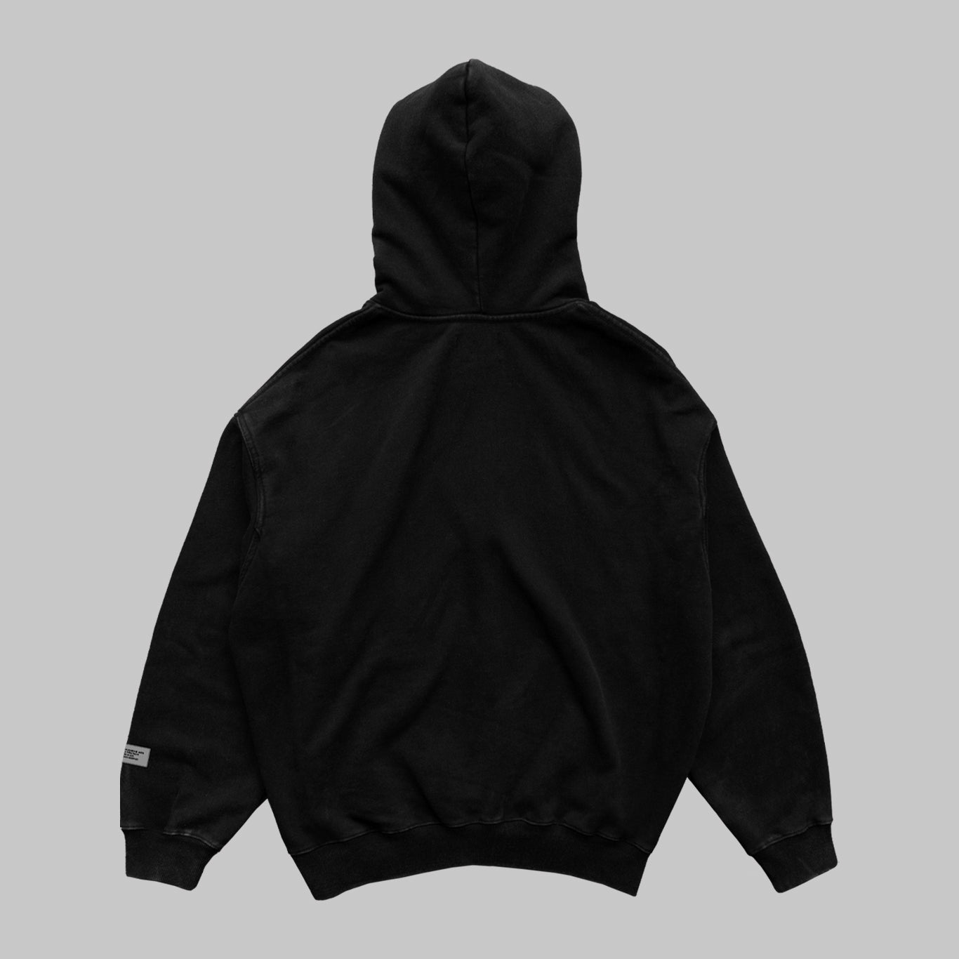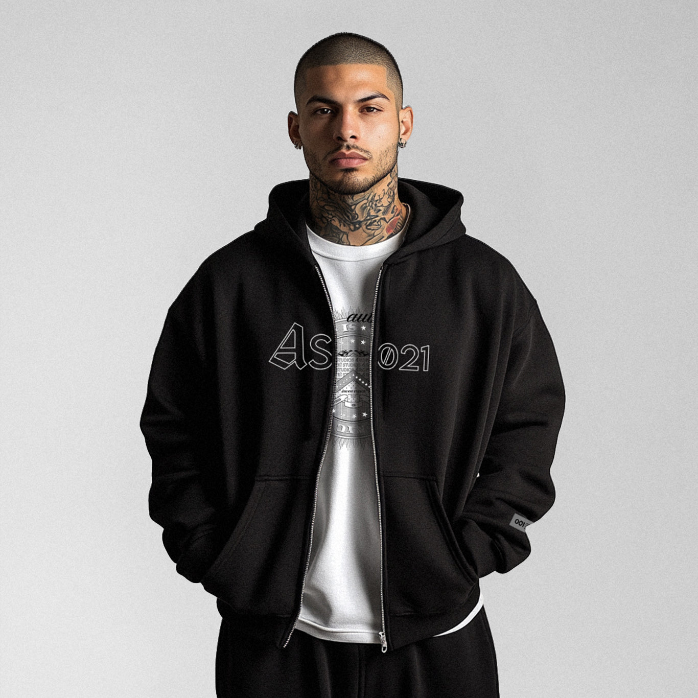 Designed for versatility, this black oversized Zip-Hoodie features a two-way zipper, front pocket, and elastic cuffs for a structured yet relaxed fit. Finished with AncientStudios® embroidery and a numbered label, this unisex piece blends comfort with signature detailing.