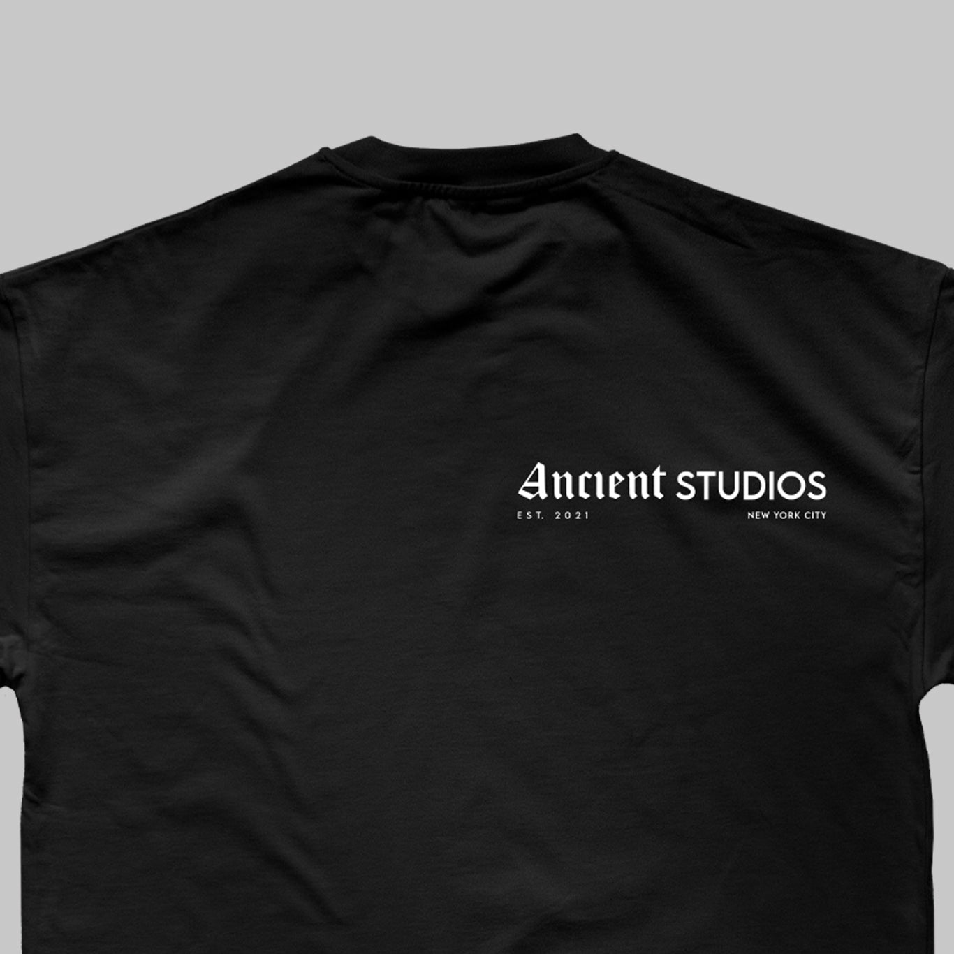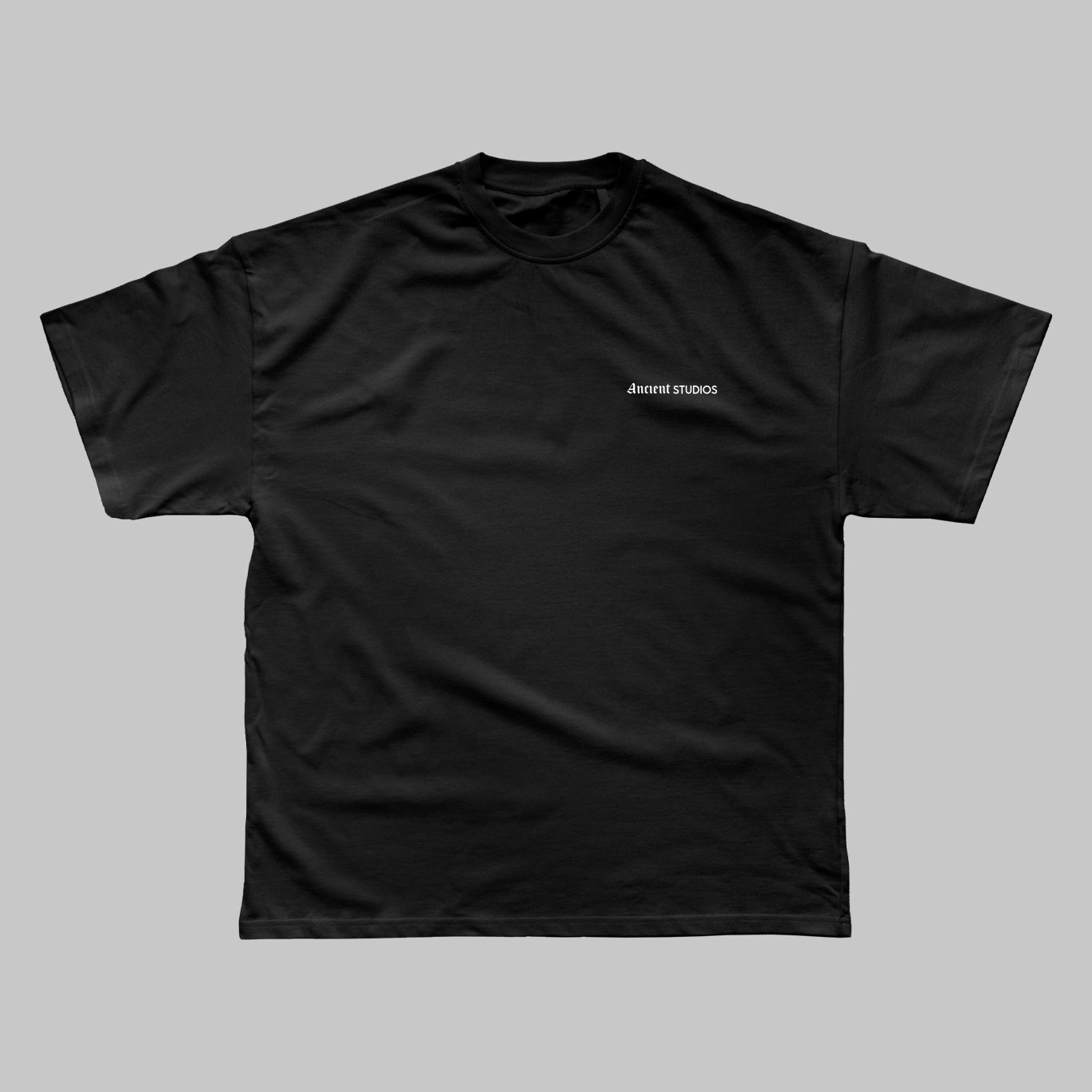 The Standard T-Shirt in black features an oversized boxy fit with dropped shoulders and a ribbed collar for a clean, structured look. Finished with a bold digital Ancient Studios® print, this unisex essential blends everyday wear with elevated design.