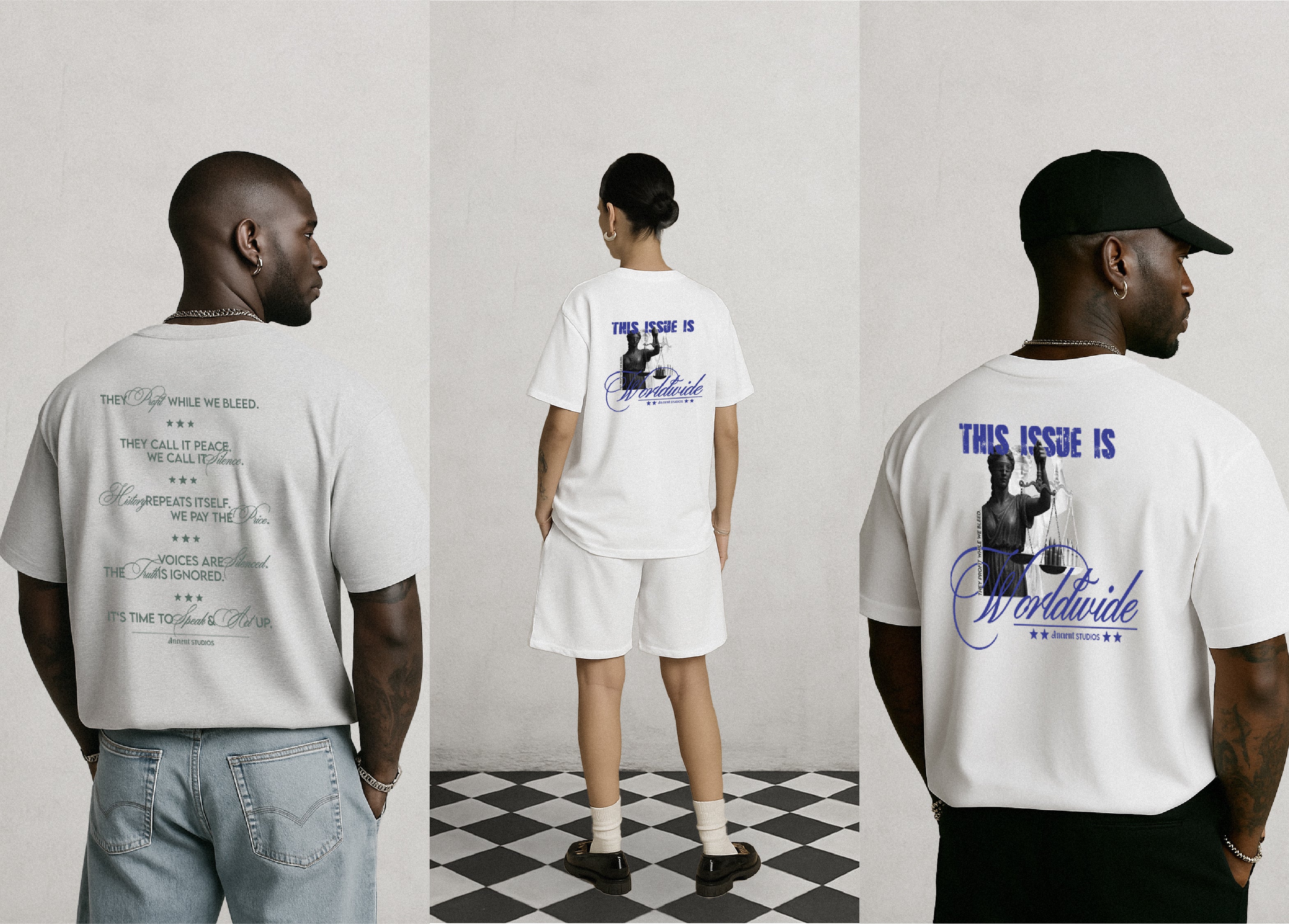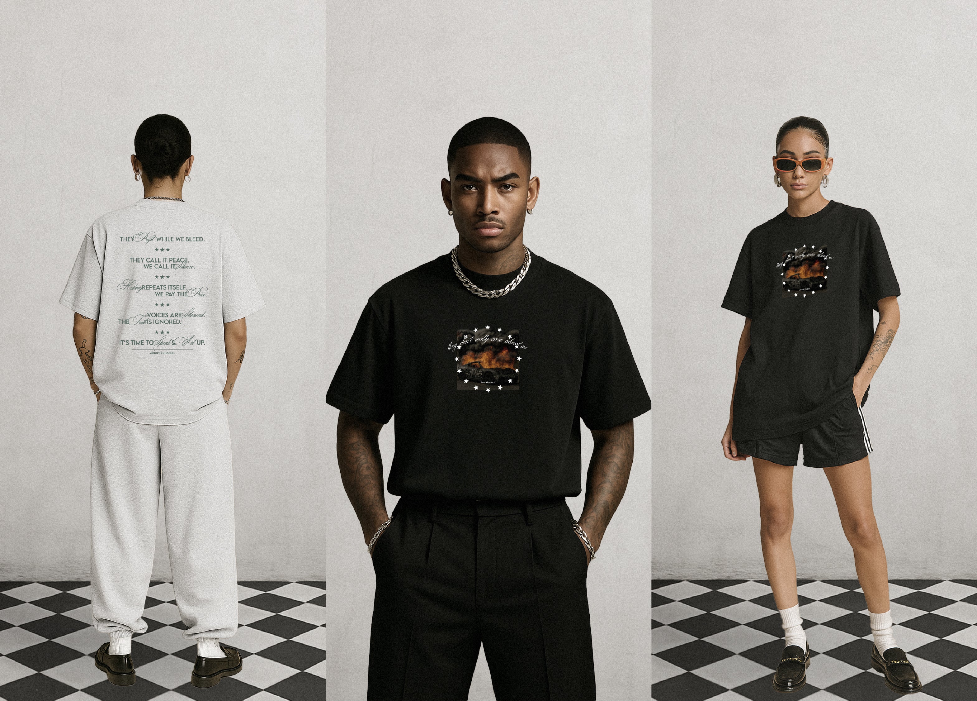 Made up of three distinct t-shirts, each piece tells a different part of the same story — a story of oppression, manipulation & resistance. The prints are bold & unapologetic. They reflect the feeling of standing in the middle of a system that was never built for us. But they also carry strength — the kind of strength that comes from awareness, from unity, from the refusal to stay silent.