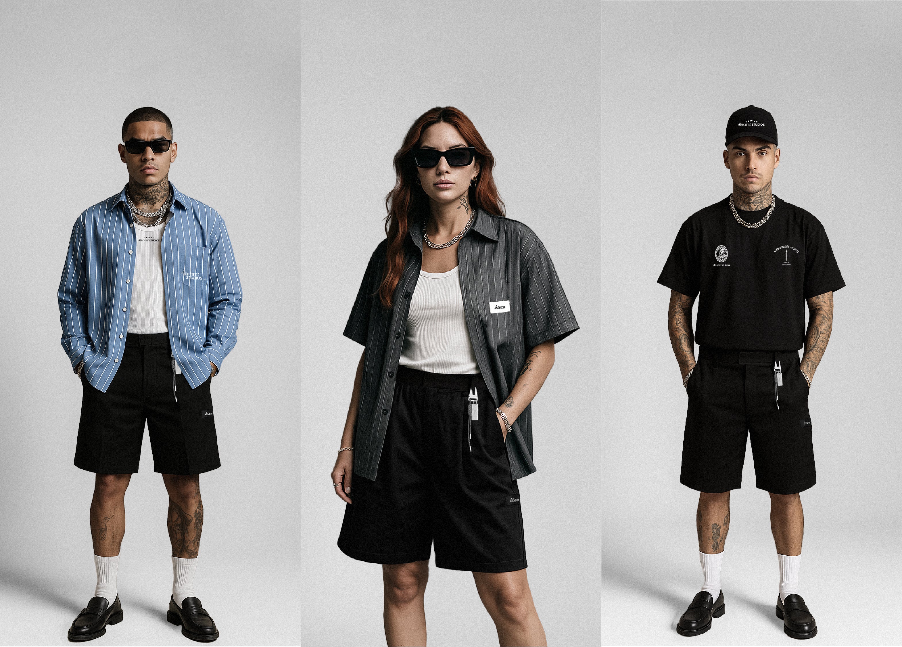 The moodboard captures it all: textured landscapes, glistening cityscapes, and iconic silhouettes echo through each design, complemented by tailored lines and subtle details. From the understated sophistication of the pinstriped shirts and tailored shorts to the raw edge of tanks and graphic tees, every item speaks to the idea of crafting a legacy, not just wearing one.