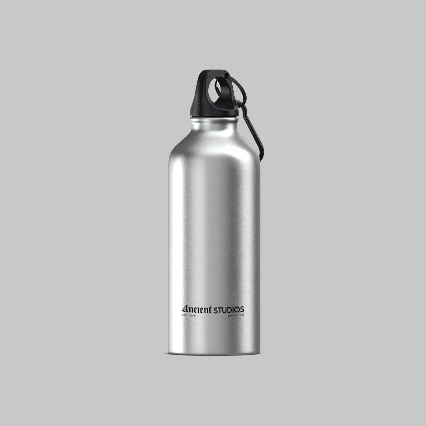 The Aluminium Bottle in silver holds 350ml and features a sleek, minimalist design with a bold Ancient Studios® print. Crafted from durable aluminium and finished with a black carabiner for easy attachment on the go.