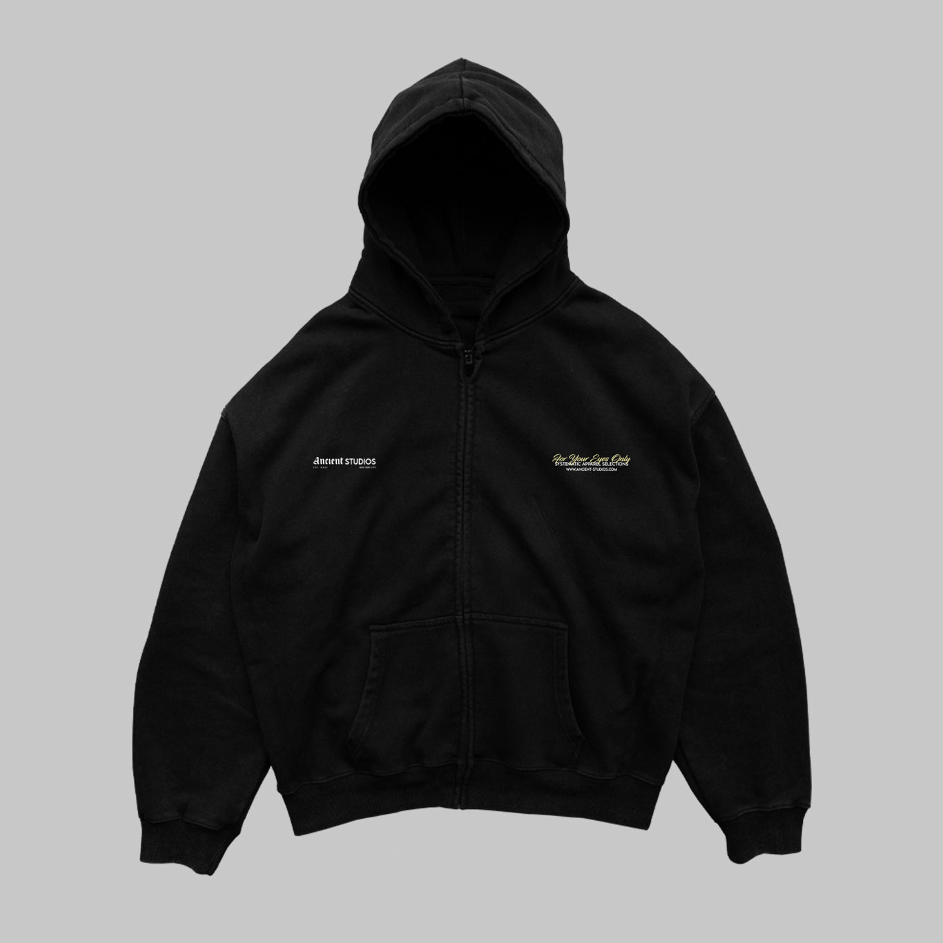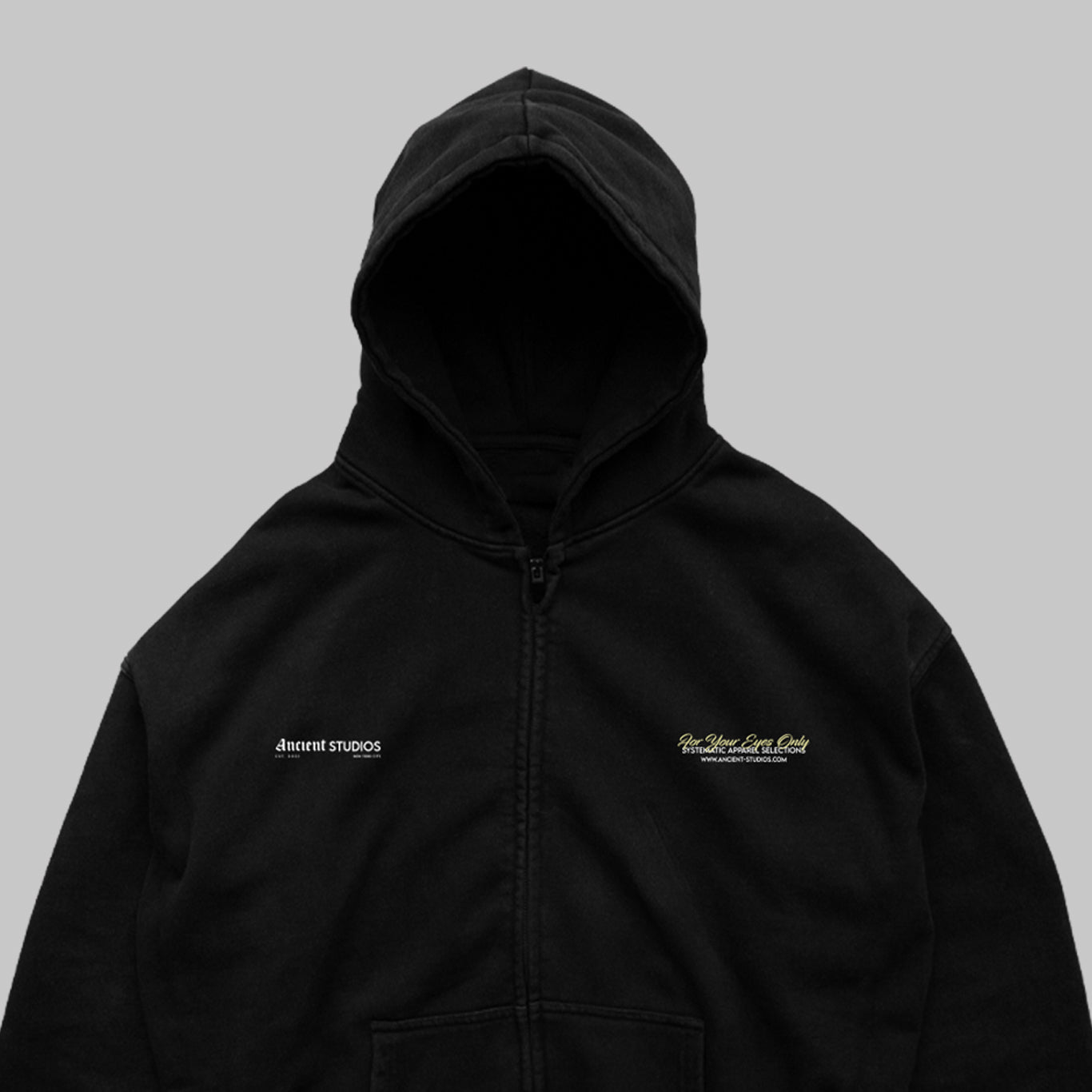 The Ancient Studios® Washed Zip Hoodie in black features an oversized fit, a durable YKK zipper, and a front pocket for everyday functionality. Designed as a unisex essential, it is finished with elastic cuffs and bold Ancient Studios® prints on the chest and back for a signature look.