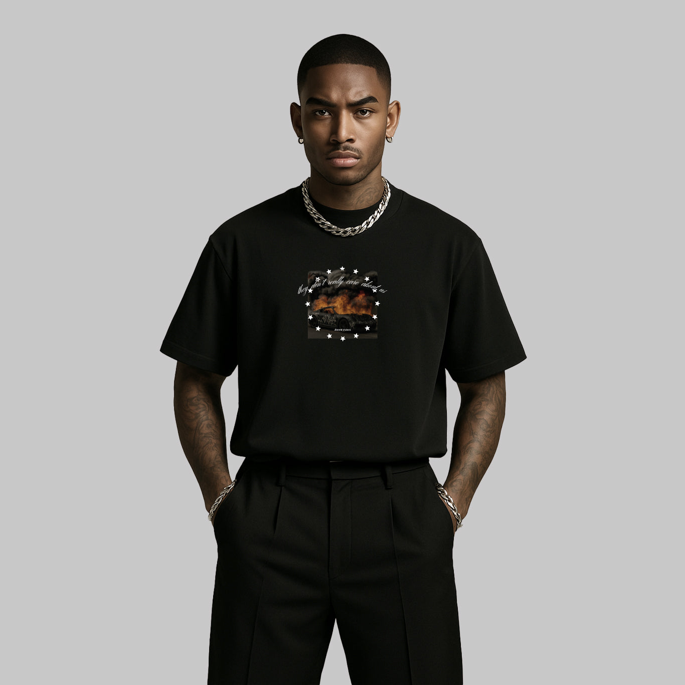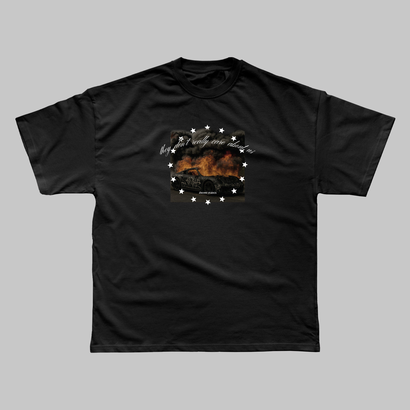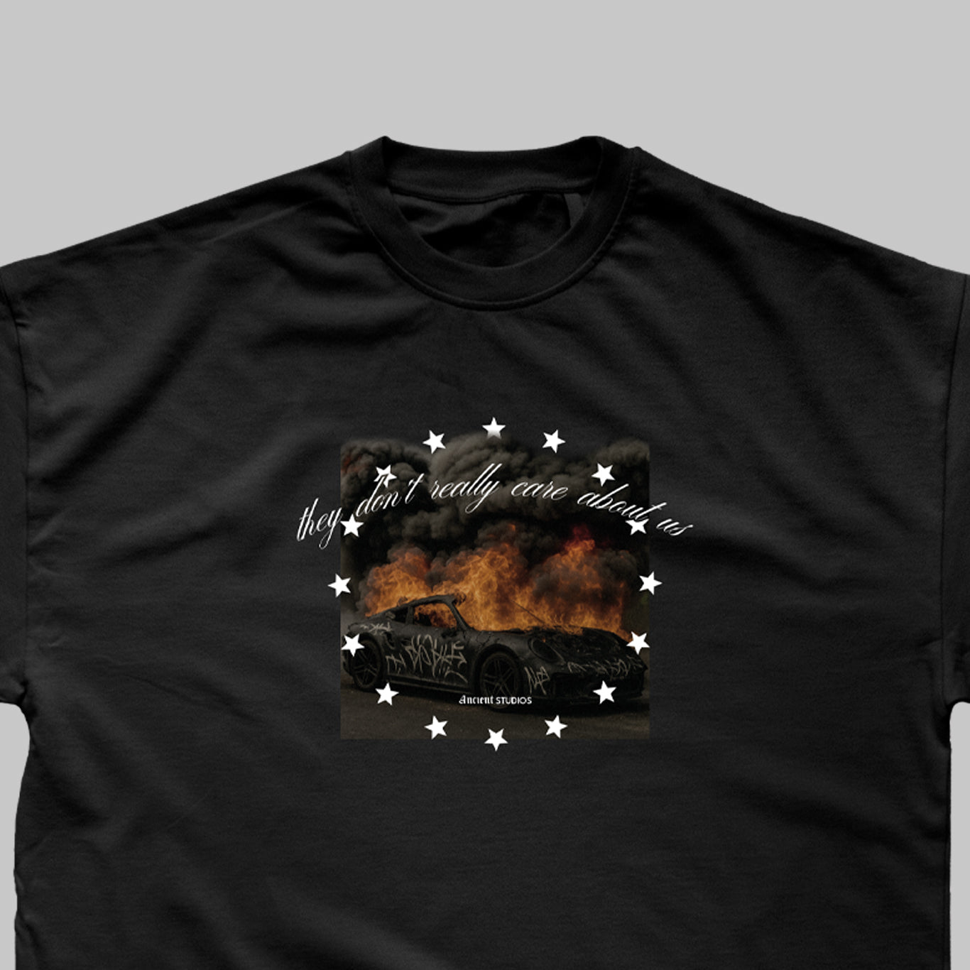 The Injustice T-Shirt in black delivers a bold visual statement with a front graphic of a burning car, encircled by contrasting white stars. Across the image, a handwritten script reads “If you don’t really care, then shut up”, fusing raw emotion with unapologetic protest. Cut in a boxy, oversized fit with dropped shoulders and a ribbed collar, this unisex tee is a confrontation with apathy—crafted for those who choose to speak through what they wear.