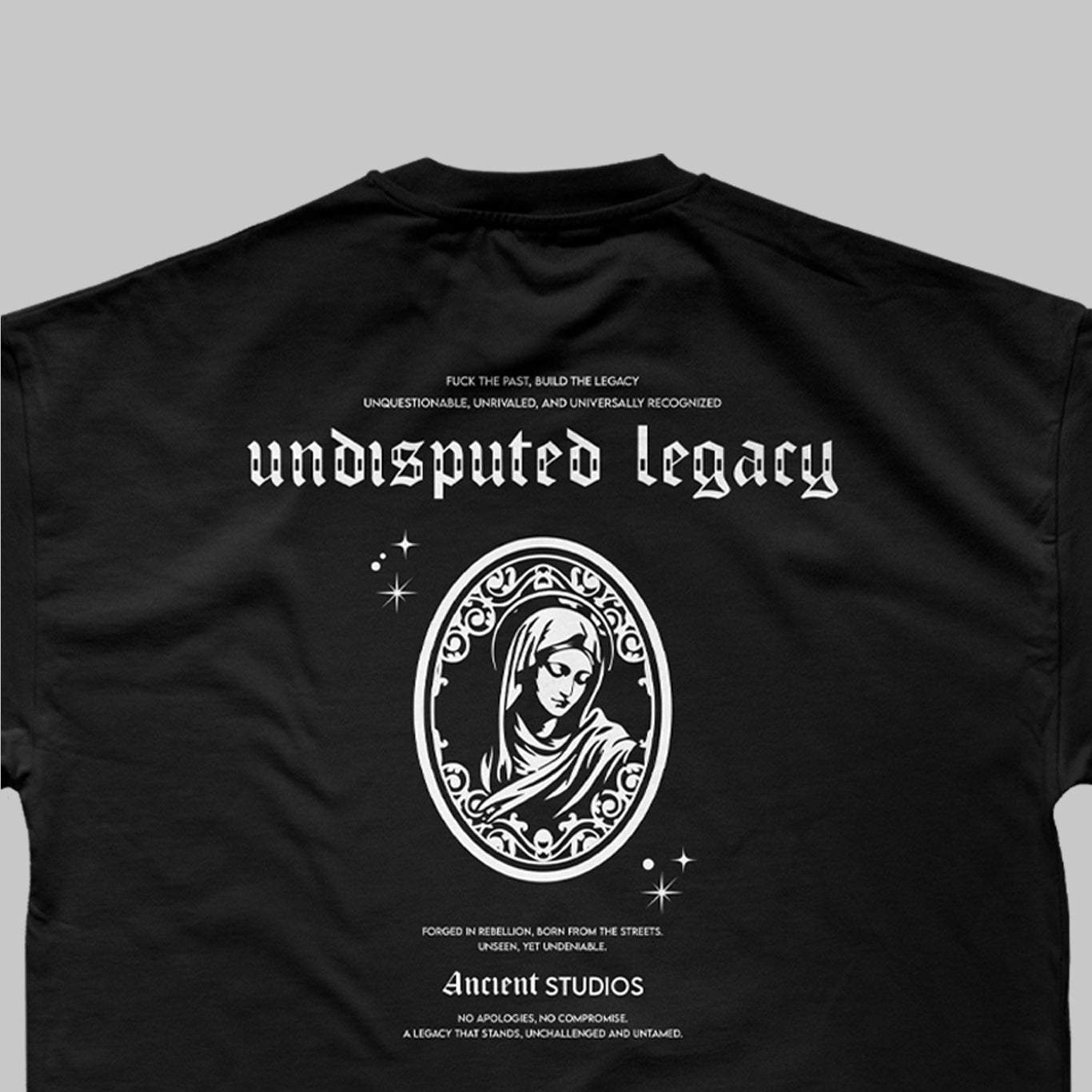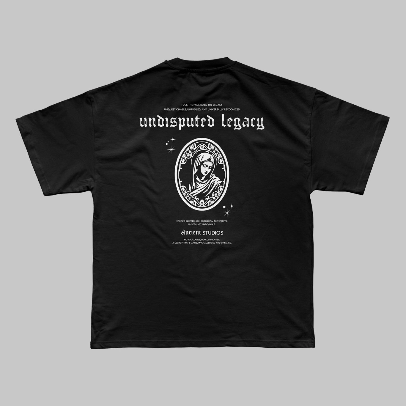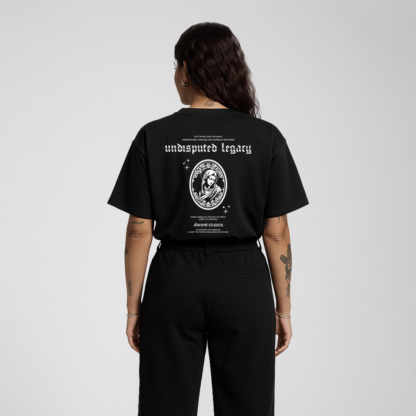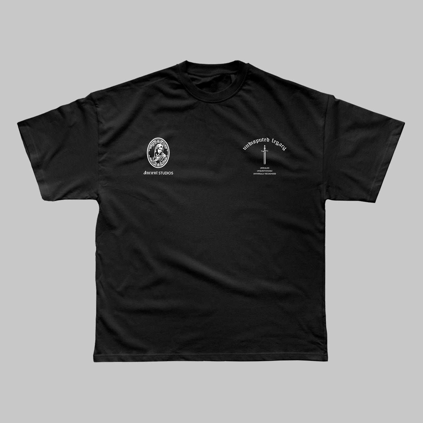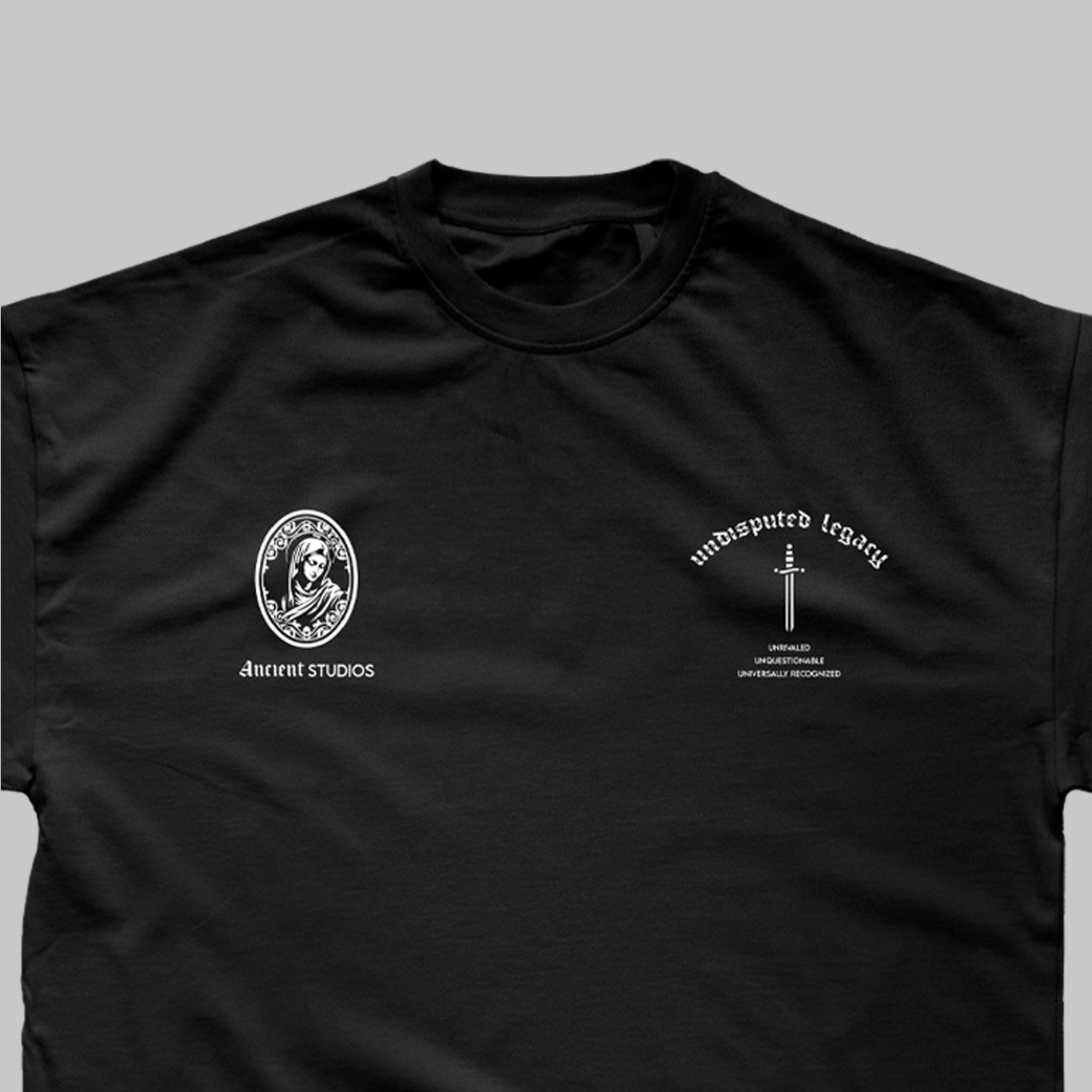 The Legacy T-Shirt in black features an oversized fit with dropped shoulders, and a ribbed collar for a worn-in, elevated look. Finished with a bold Ancient Studios® print and crafted with a soft handfeel, this unisex piece embodies effortless edge.