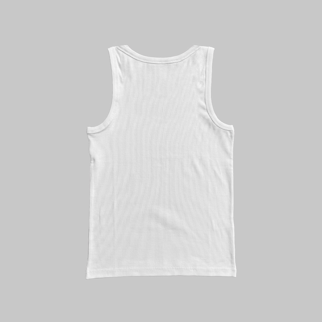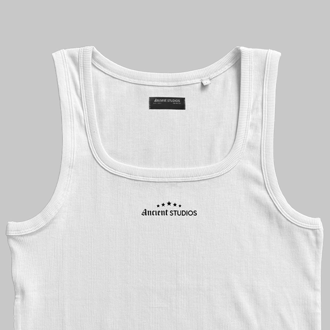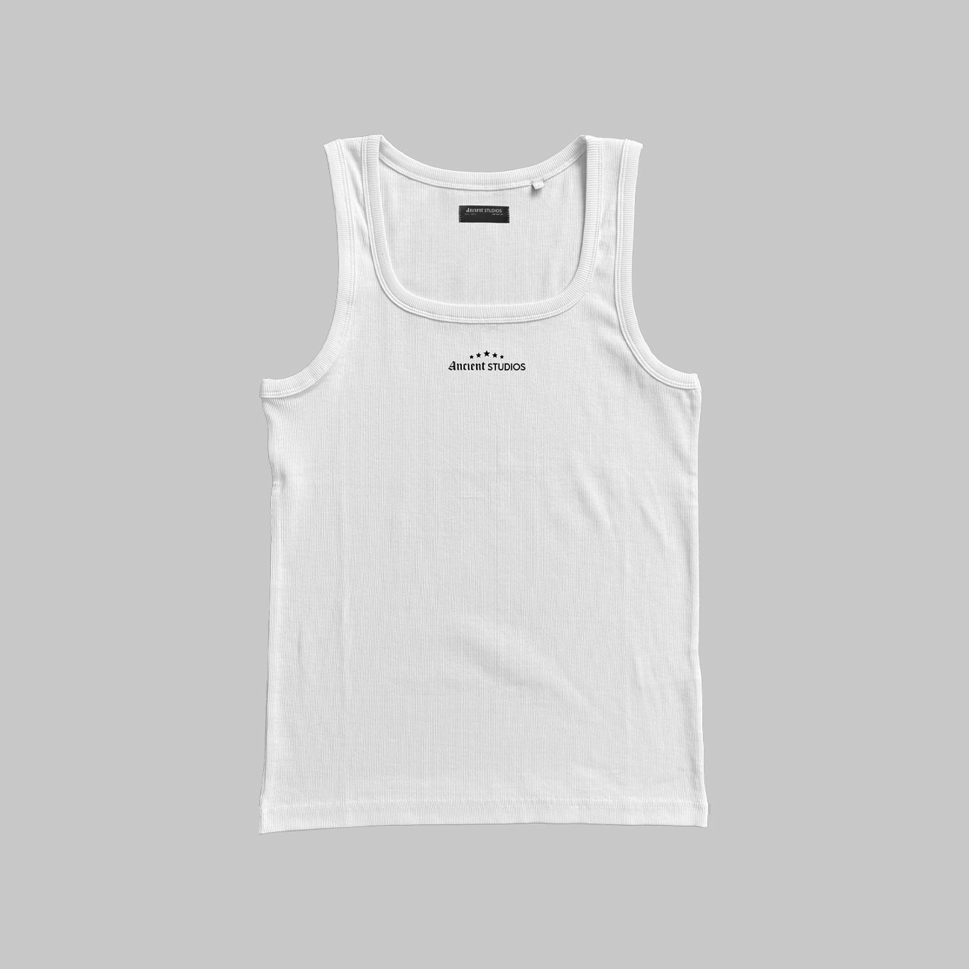 The Star Tank Top in white features a slim fit with a ribbed structure and ribbed collar for a sleek, form-fitting silhouette. Designed with a soft handfeel, it is elevated by signature Ancient Studios® embroidery details for a refined, modern edge.