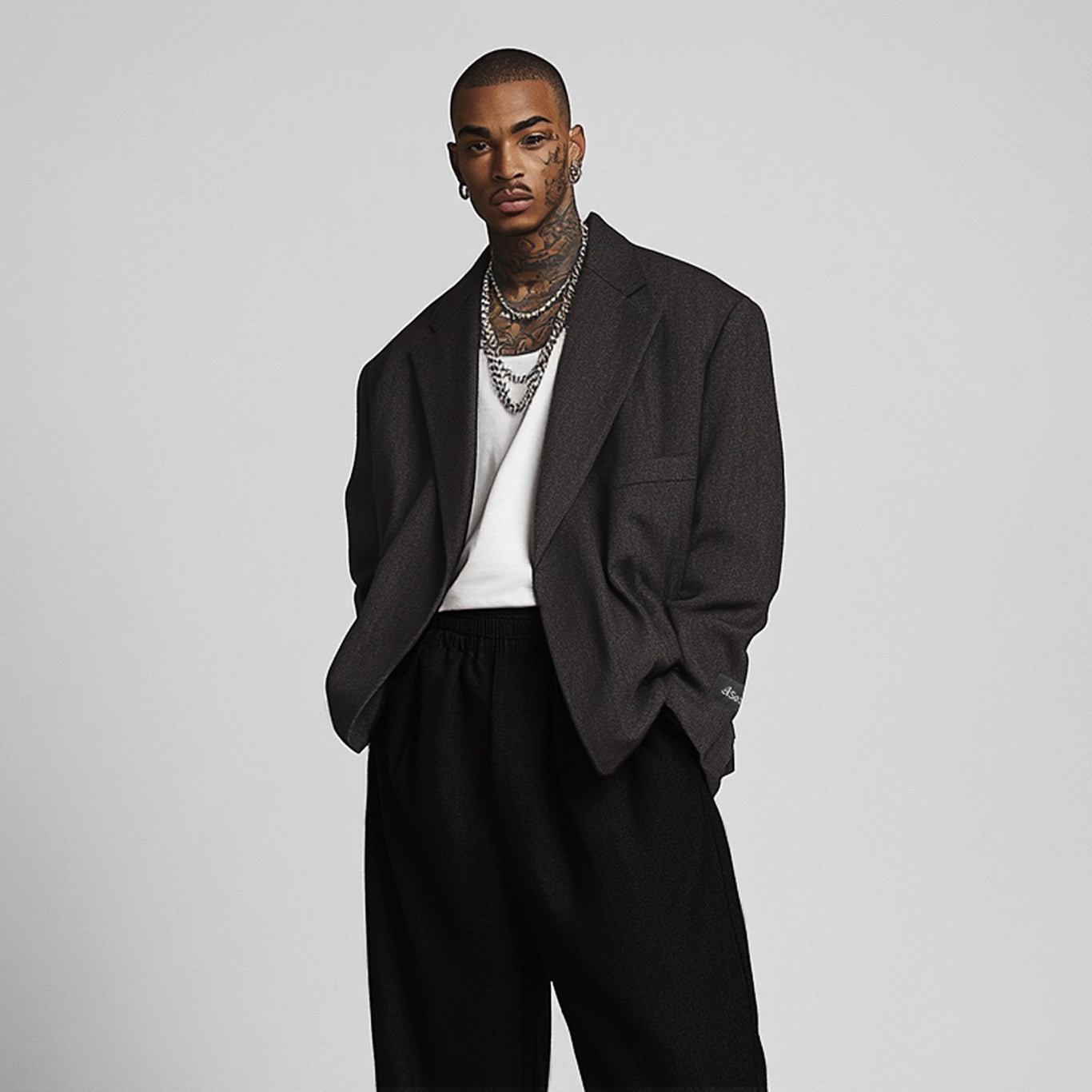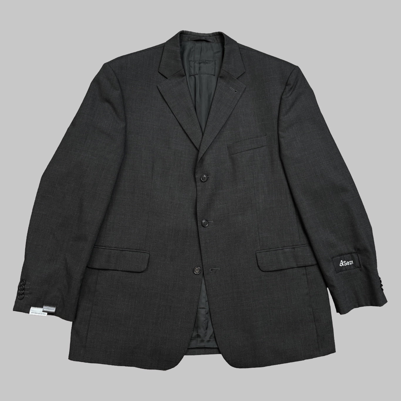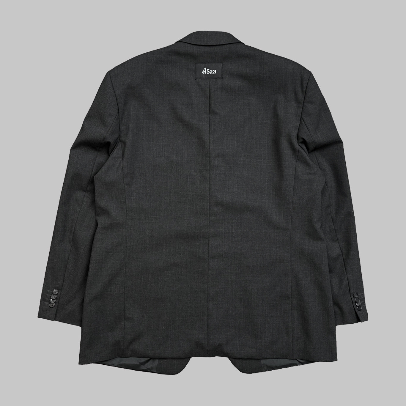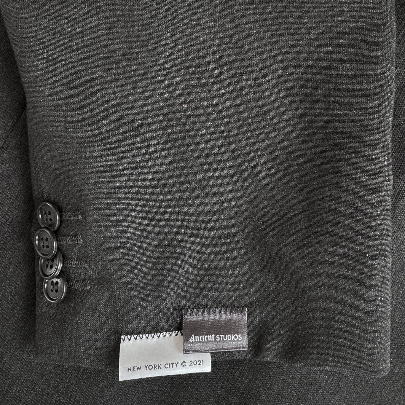 Vintage sourced dark grey Blazer, that was refined in Germany. A bold fusion of vintage and modern streetwear. Featuring an oversized straight fit, rising lapel, and piped flap pockets, this unisex piece is finished with buttoned cuffs and an inside pocket for utility. Signature AncientStudios® patches and tags add a refined touch.