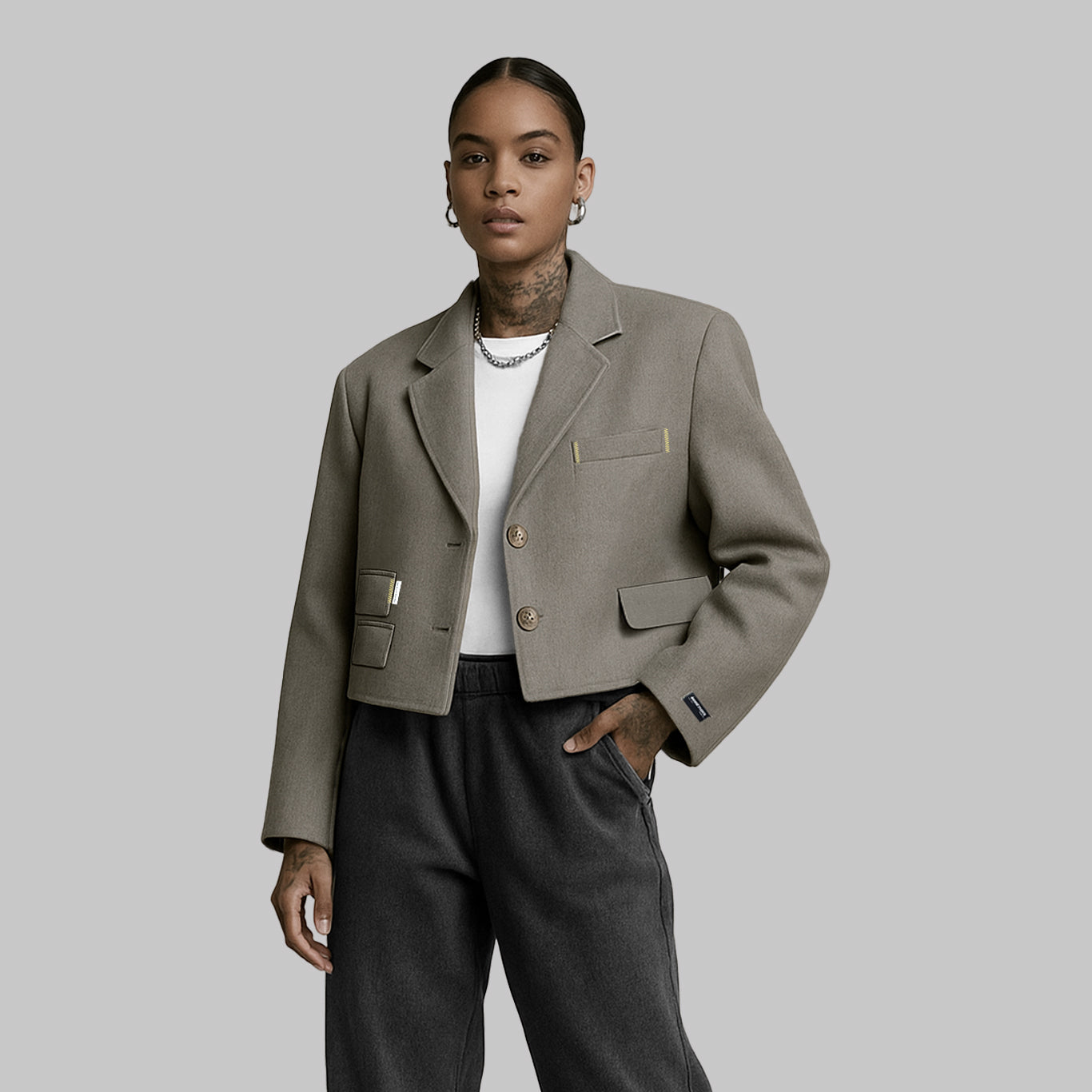 The Cropped Contrast Blazer in sand turns tradition on its head. With its boxy, cropped cut and exposed seams, it’s sharp, unfinished — and unapologetically intentional. Every stitch is a statement. Studio made. One of one. For the bold.