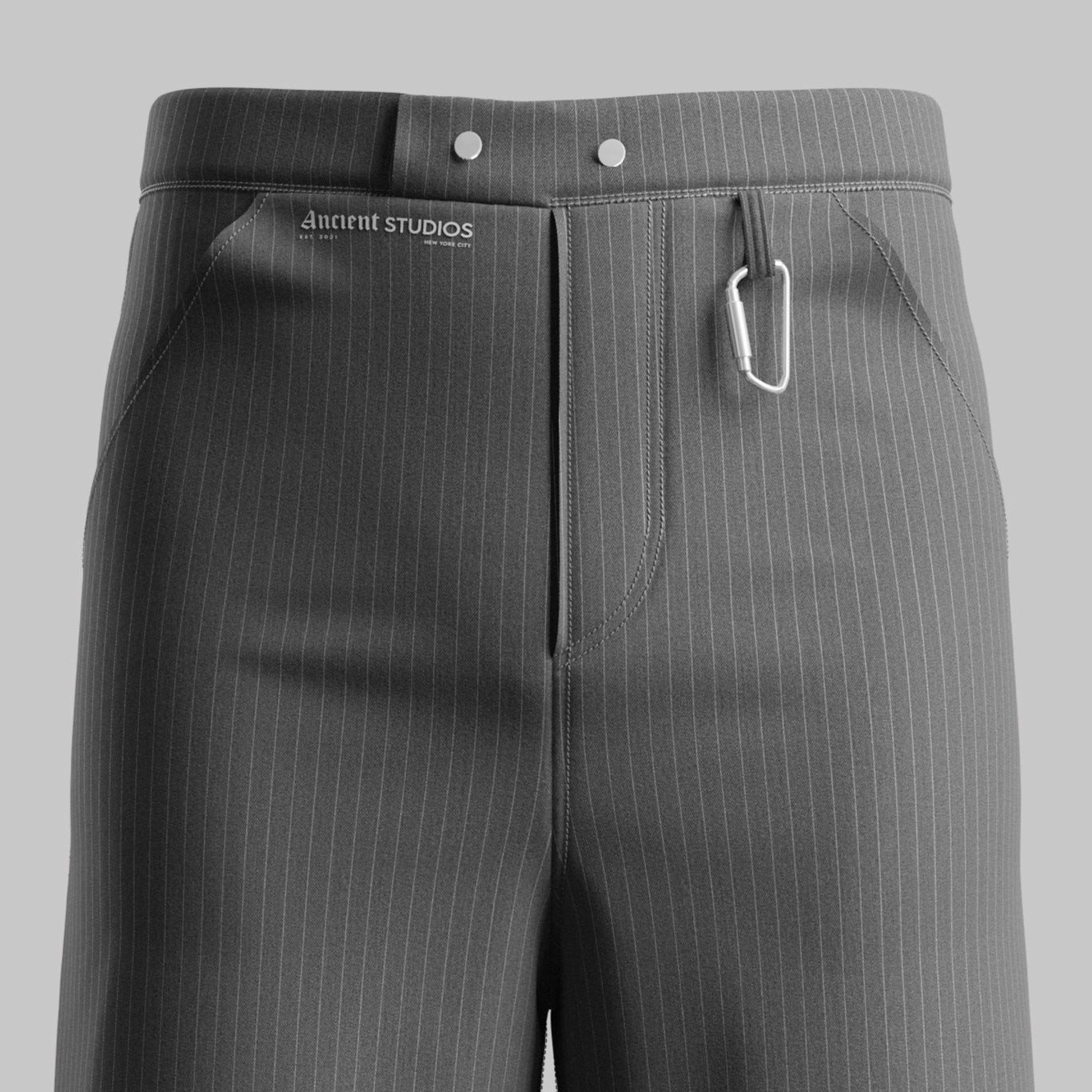 The Formal Shorts in grey pinstripes feature a regular fit with a straight leg, slit pockets, and a subtle utility detail for a refined yet functional look. Finished with an Ancient Studios® print, a signature neon tag, and marked 1 of 1, this piece is handmade and uniquely crafted in Germany.