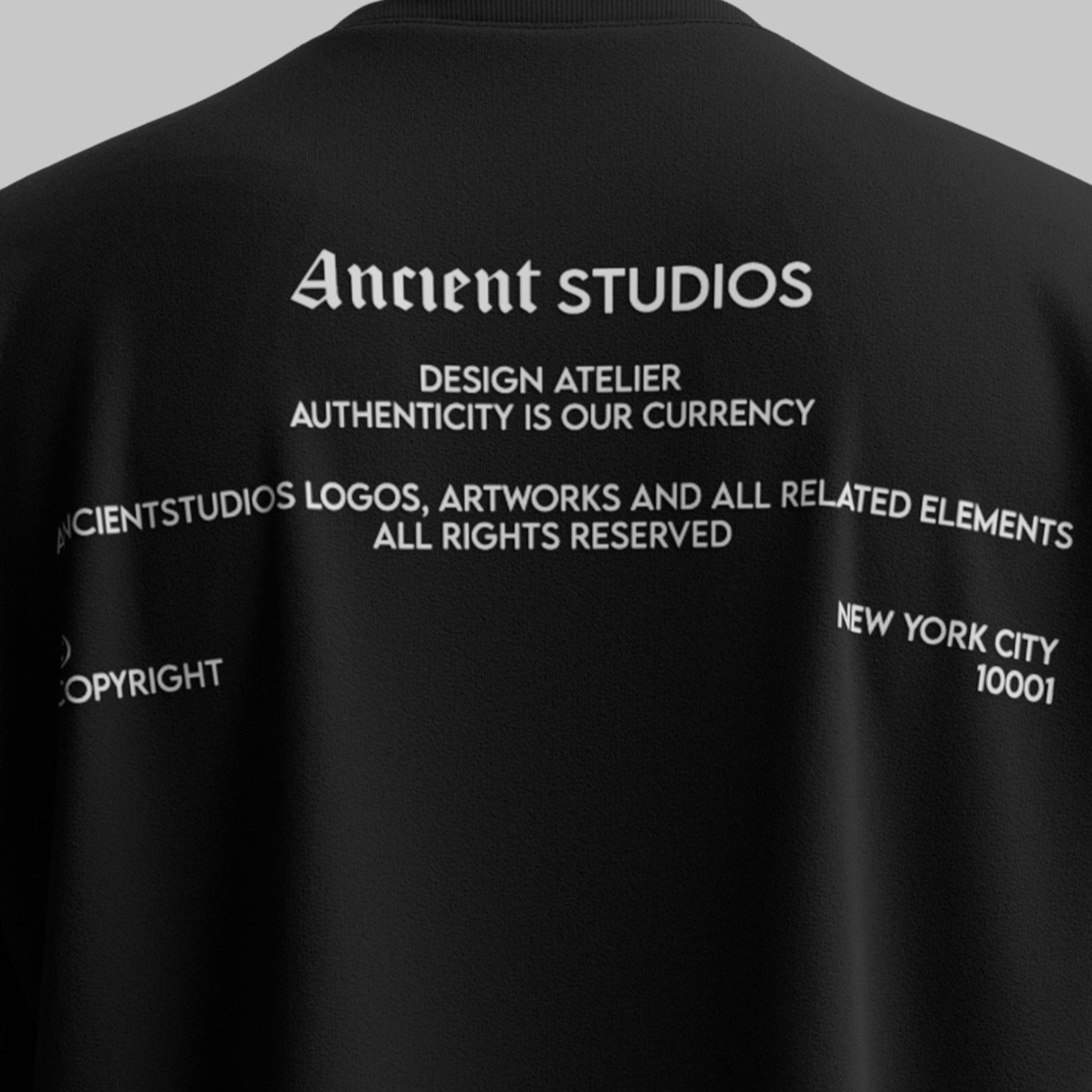 The Fundamental T-Shirt in black features an oversized fit with dropped shoulders, short sleeves, and a ribbed collar, all crafted for a soft, premium hand feel. Finished with a bold Ancient Studios® print, a signature neon tag, and marked 1 of 1, this piece is handmade and uniquely made in Germany.
