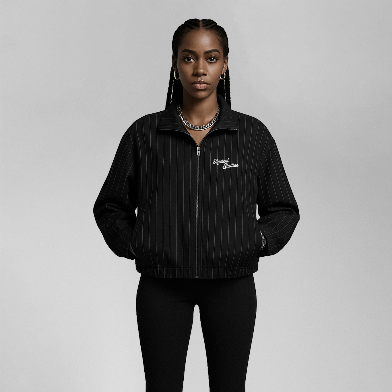 The Pinstriped Track Jacket in black redefines classic tailoring through a streetwear lens. Its relaxed fit, contrast pinstripes, and elastic trims create a look that moves with purpose — never passively. Finished with custom labels and made to order, this jacket speaks for those who craft their own lane.