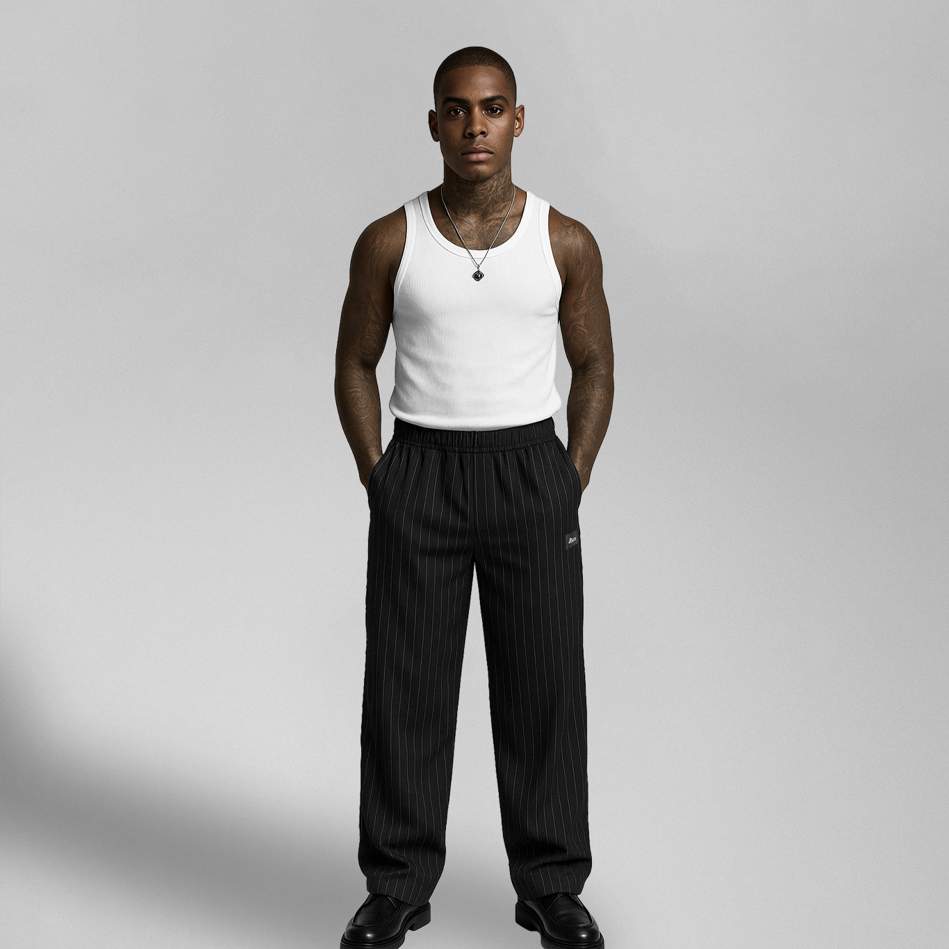 The Pinstriped Trackpants are a study in contrasts — laid-back in fit, refined in fabric. Crafted from Italian virgin wool and cut in a relaxed, baggy silhouette, they blur the line between streetwear and tailoring. Subtle pinstripes and our side logo patch give them quiet attitude — made for those who dress with intent.