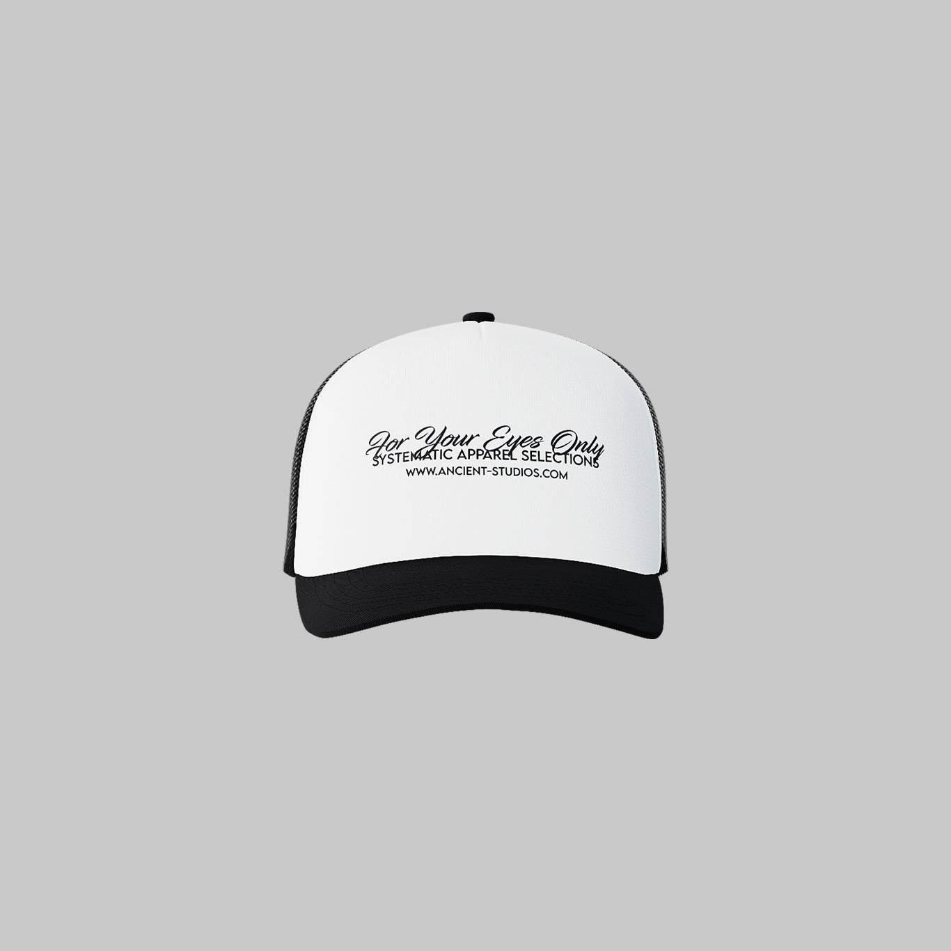 The Trucker Cap features a white foam front with a black mesh back for breathability and a classic streetwear aesthetic. Designed as a unisex piece, it includes an adjustable fit and a bold Ancient Studios® print for a signature finish.